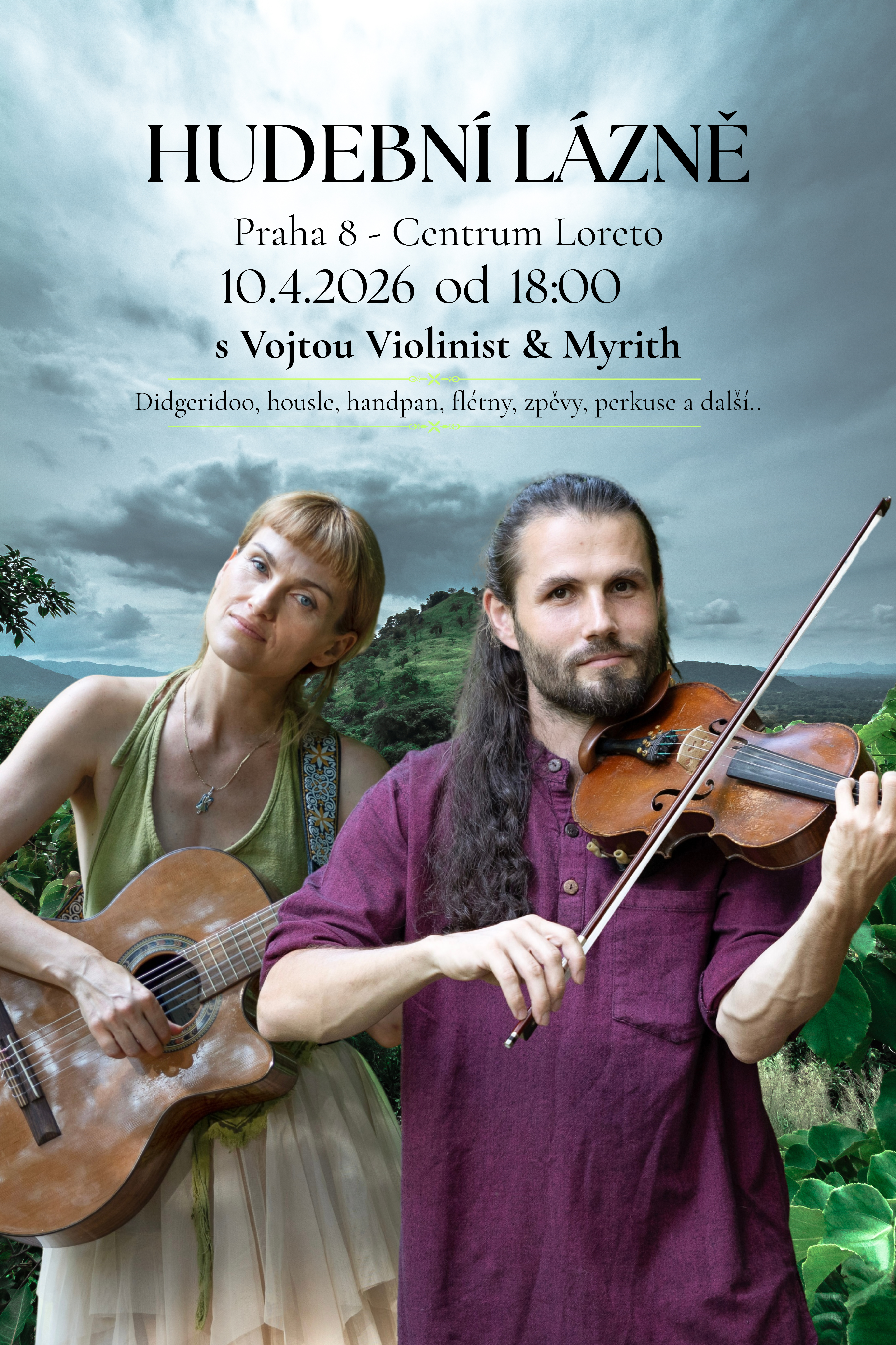 Hudební lázně s Vojtou Violinist a Myrith – večer, kdy si lehnete, zavřete oči a necháte se nést živou hudbou, který vzníká v přítomném okamžiku na didgeridoo, handpanem, hlasem, flétnami, houslemi, šamanskými bubny a jemnými melodiemi, zvuky a rytmy na další terapeutické nástroje.