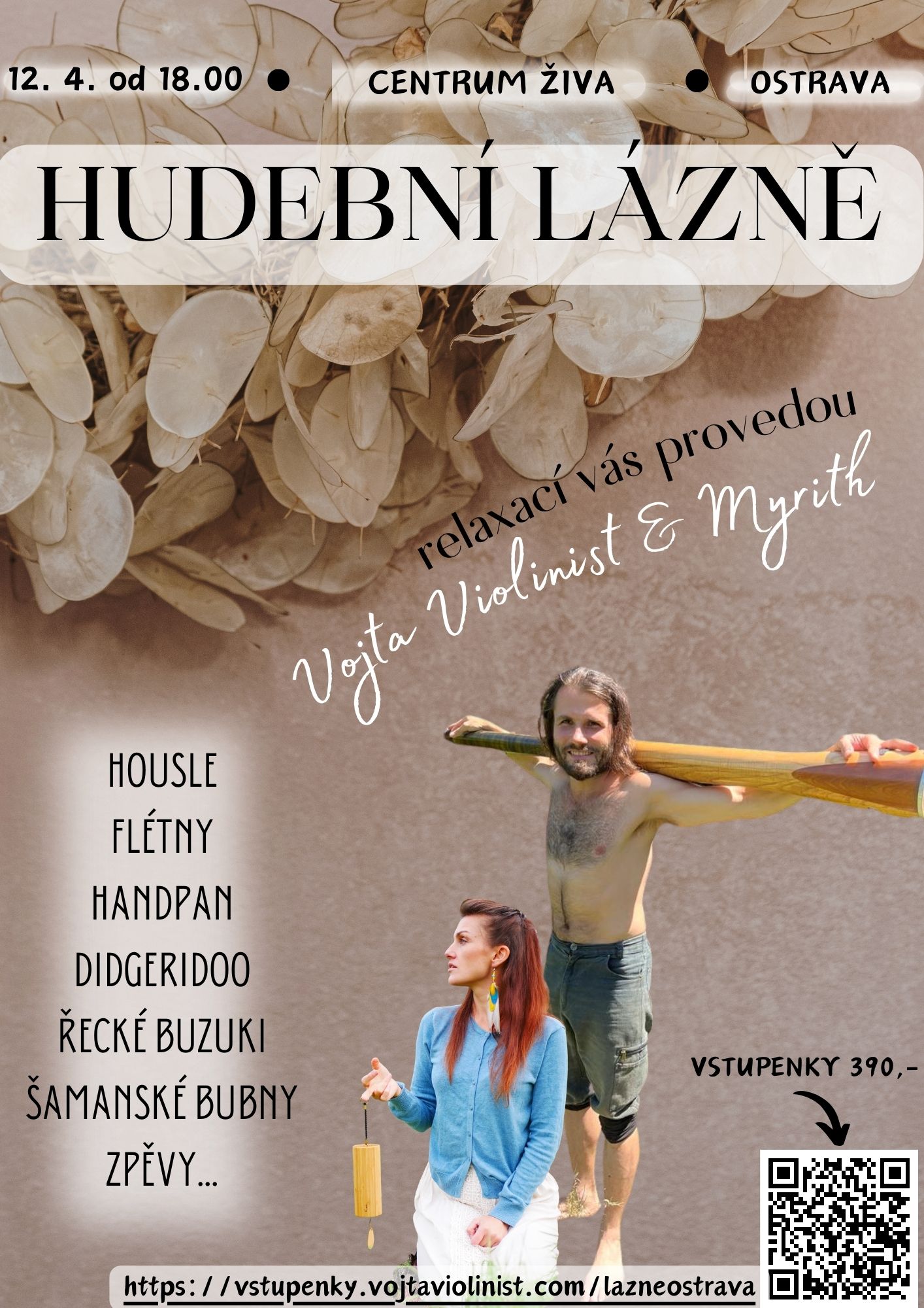 Provedou Vás multiinstrumentalista Vojta Violinist a Myrith, písničkářka, která se věnuje objevování tajemství hlasu. Spolu s intuitivním zpěvem vás pohladí tóny a melodie nástrojů jako jsou didgeridoo, housle, flétny bansuri, handpan, šamanské bubny, djembe a další…
